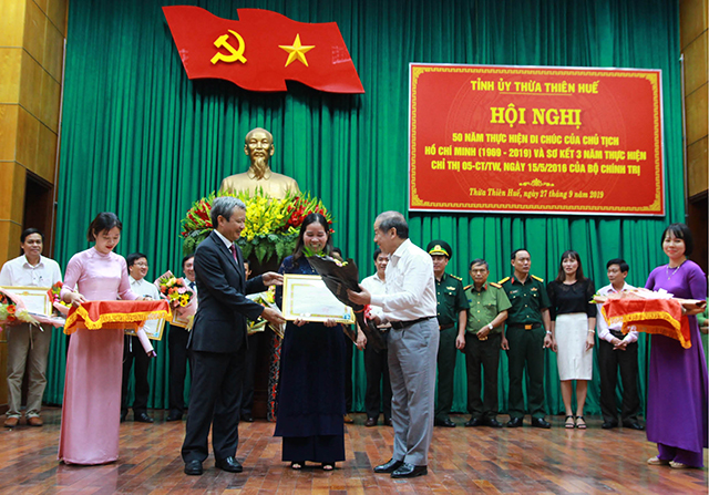 Bí thư Tỉnh ủy Lê Trường Lưu và Chủ tịch UBND tỉnh Phan Ngọc Thọ trao Bằng khen cho các tập thể, cá nhân có những hành động, việc làm ý nghĩa trong học Bác. Ảnh: AP