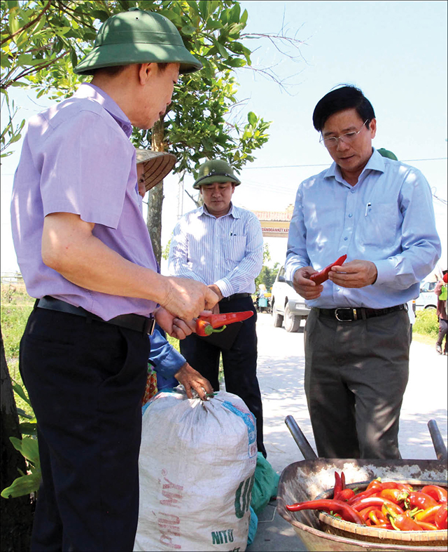 Lãnh đạo huyện Phong Điền (bên phải) về cơ sở để giải quyết vấn đề thu mua ớt cho bà con nông dân (Ảnh tư liệu)