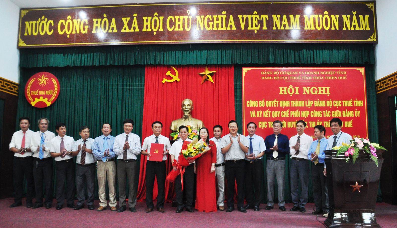 HNN.VN - Chiều 7/10, đã diễn ra hội nghị công bố quyết định thành lập Đảng bộ Cục Thuế tỉnh, các Đảng bộ bộ phận và Chi bộ trực thuộc, đồng thời, ký kết Quy chế phối hợp giữa Đảng ủy Cục thuế với các huyện ủy, thị ủy và thành phố Huế.