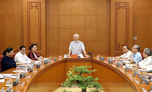 Tổng Bí thư, Chủ tịch nước Nguyễn Phú Trọng, Trưởng Tiểu ban Văn kiện Đại hội XIII của Đảng chỉ đạo công tác chuẩn bị cho Đại hội. Ảnh: TTXVN