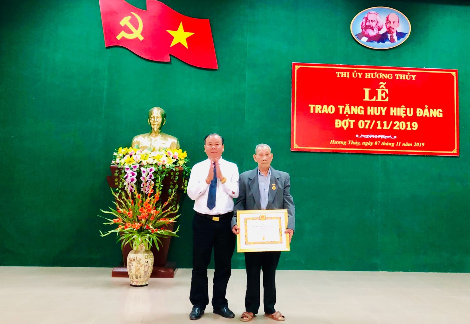 Bí thư Thị ủy Hương Thủy Lê Văn Chính chúc mừng Đảng viên nhận Huy hiệu 60 năm tuổi Đảng