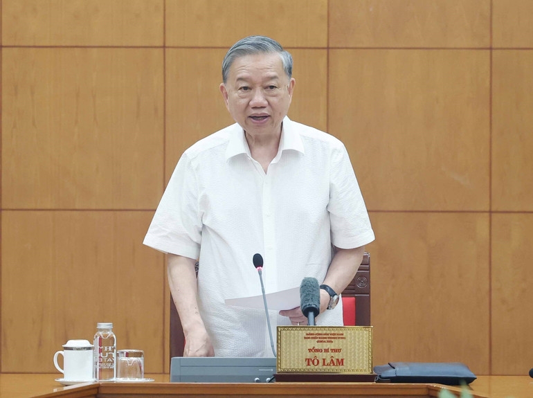 | Tổng Bí thư Tô Lâm phát biểu chỉ đạo tại buổi làm việc. (Ảnh: TTXVN) |