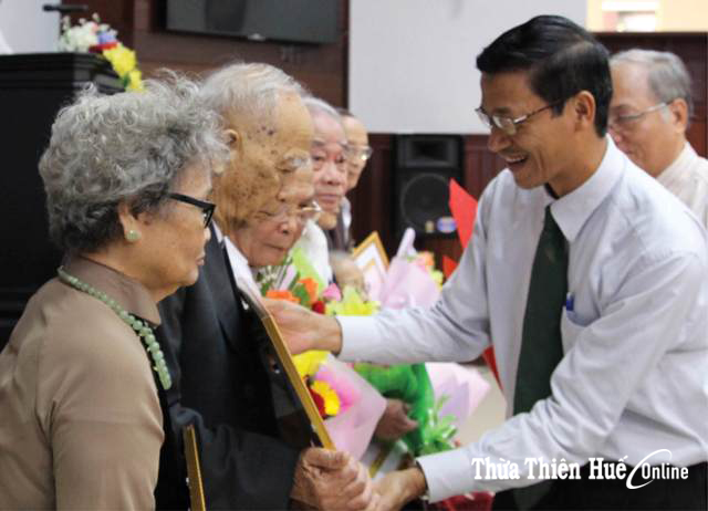Thành ủy Huế trao Huy hiệu Đảng ghi nhận sự đóng góp của các đảng viên cao tuổi. Ảnh: Anh Phong