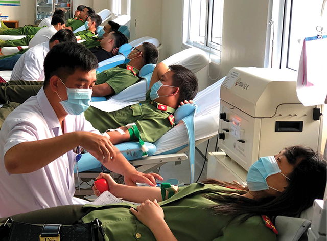Thời gian qua, Đoàn Thanh niên Công an tỉnh còn tích cực tham gia hiến máu tình nguyện. Nhiều cán bộ, chiến sĩ trở thành “ngân hàng” máu sống, sẵn sàng tham gia cung cấp máu để cứu người không may gặp tai nạn hoặc mắc bệnh hiểm nghèo… Đại úy Trương Công Tuyên, Bí thư Chi đoàn Phòng Cảnh sát cơ động, Công an tỉnh chia sẻ, “ngân hàng” máu sống của Công an tỉnh do các đoàn viên thanh niên làm nòng cốt được duy trì hoạt động rất hiệu quả, hằng năm có hơn 400 trường hợp đăng ký tham gia hiến máu.