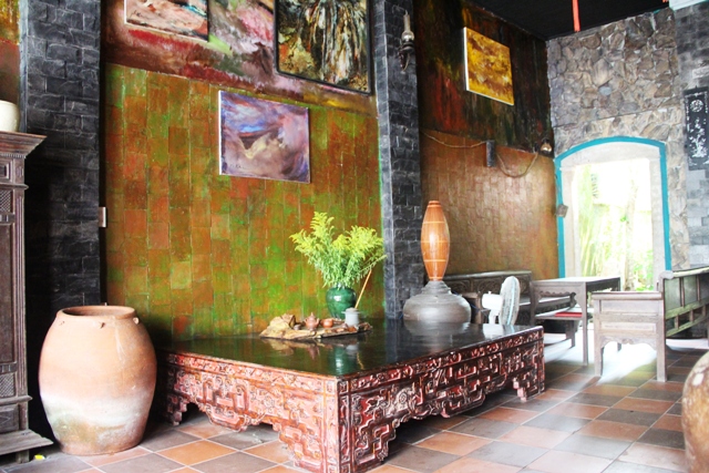 Gian ngoài cùng bày biện nhiều vật dụng bằng gỗ như, phản, rương, sập, gụ, bàn ghế… được chạm khắc rồng, phượng, hoa văn tinh xảo, cầu kỳ được chiếu sáng bằng chiếc đèn lồng sang trọng. Bên cạnh đó, những chiếc đèn dầu cổ xưa và những chiếc chum được bố trí đan xen khiến không gian trở nên hoài cổ. Ngồi ở đây du khách tưởng chừng như lạc vào không gian của chừng thế kỷ trước. Từ gian nhà này ngắm nhìn đường phố, sẽ cảm nhận được sự đối lập giữa cuộc sống xưa và nay. Điều đáng chú ý, các vật dụng trong gian nhà này có niên đại hàng chục năm, thậm chí hàng trăm năm như đèn đá, chày, cối, ly, tách…
