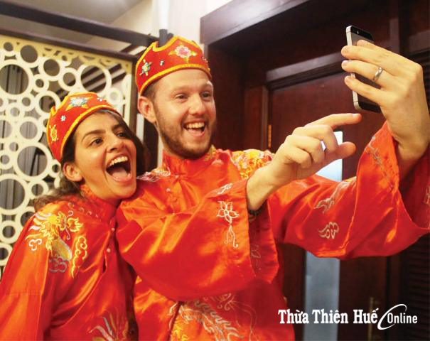 Du khách chụp ảnh lưu niệm trong trang phục truyền thống cung đình Ảnh: Phan Thành