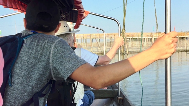 Du khách giữ thăng bằng khi di chuyển trên đầm phá