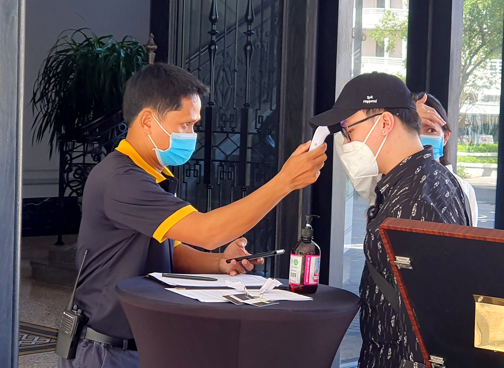 Nhân viên Khách sạn Silk Path Grand Huế kiểm tra thân nhiệt khi đón khách vào lưu trú