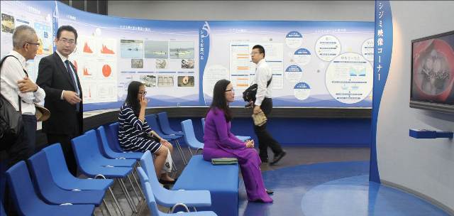 Du khách xem giới thiệu về loài hến ở hồ Shinji-ko tại Shijimi-kan