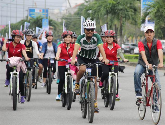 Du khách thích thú đạp xe trong không gian bình yên của Huế. Ảnh: HữU PHÚC