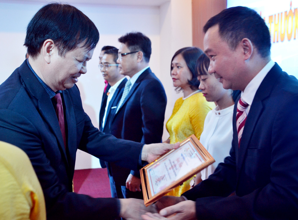 Ông Nguyễn Dung, Phó Chủ tịch UBND tỉnh Thừa Thiên Huế (bên trái) trao chứng nhận giải thưởng cho ông Hoàng Văn Khánh, Giám đốc Vietravel - Chi nhánh Huế
