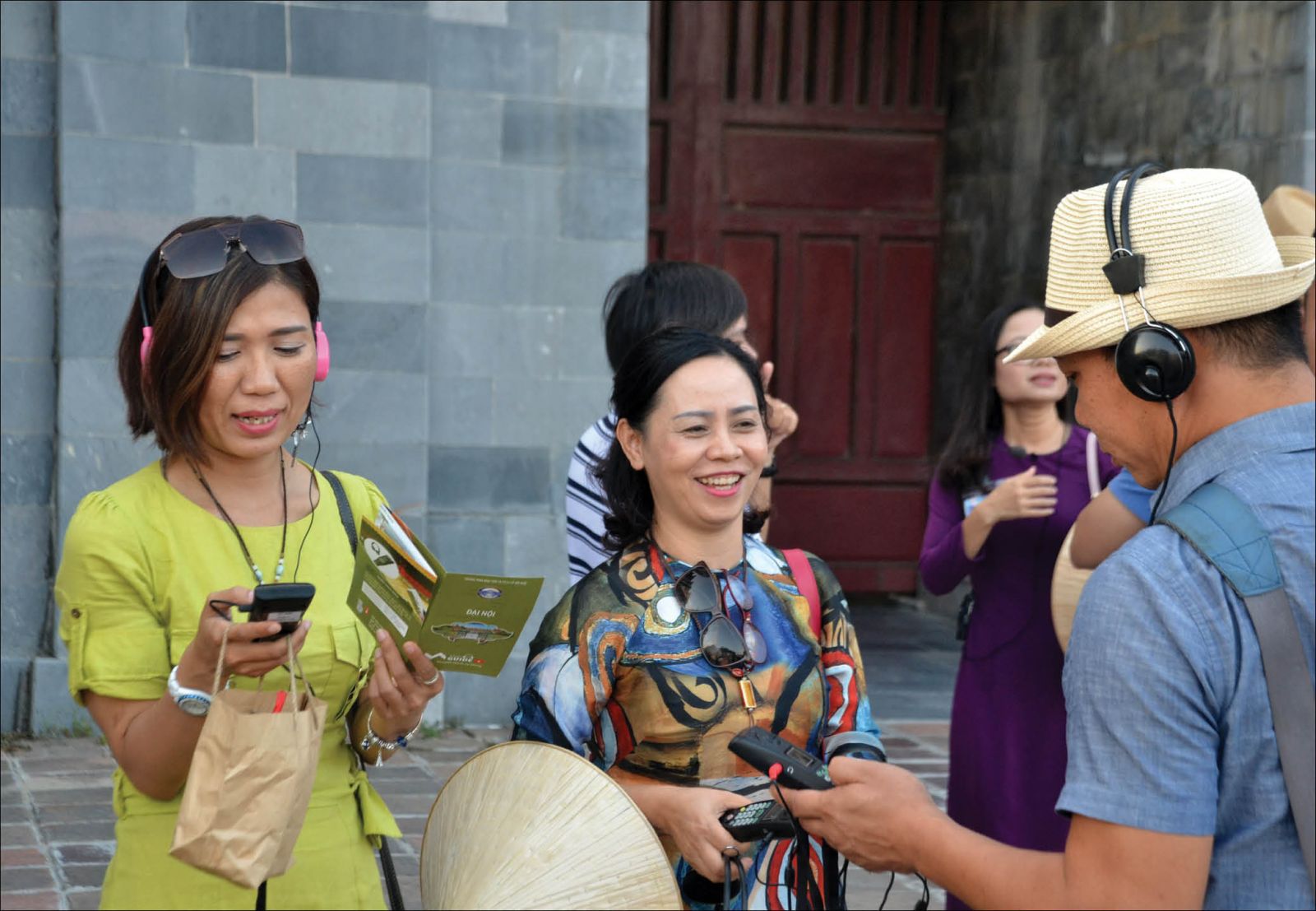 Du khách tìm hiểu dịch vụ thuyết minh tự động khi tham quan Đại Nội