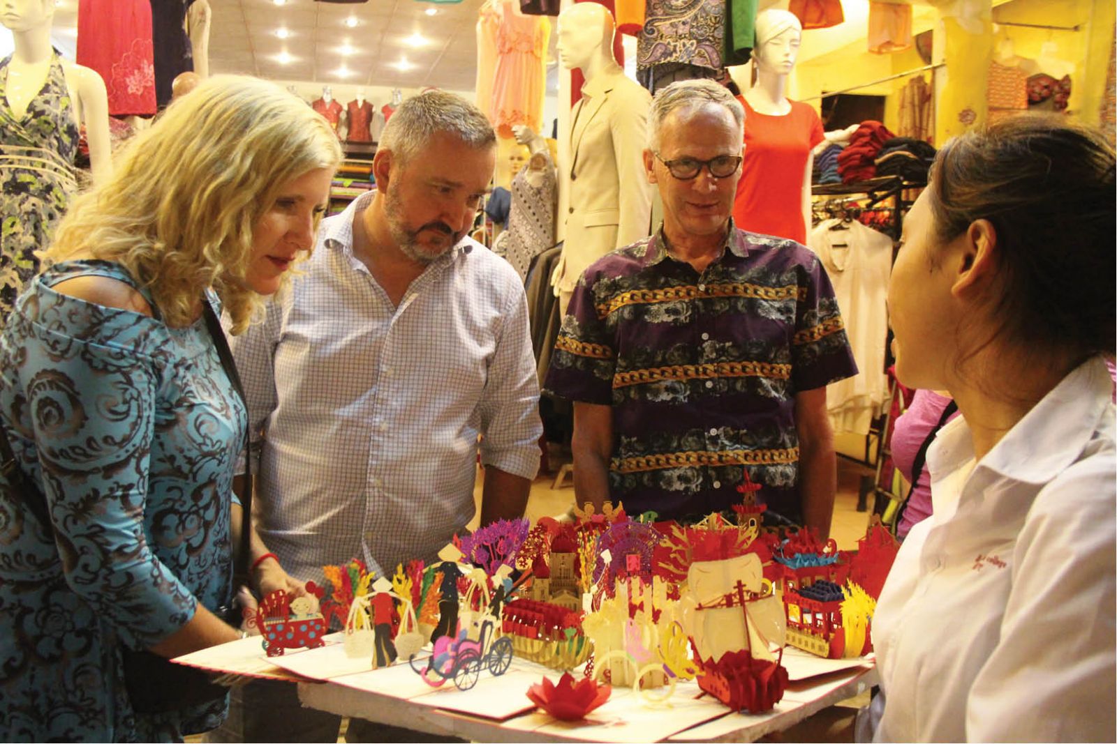 Việc chấn chỉnh tình trạng chặt chém du khách nhằm gìn giữ môi trường du lịch an toàn. (Trong ảnh: Du khách nước ngoài mua hàng lưu niệm trên khu phố Tây)