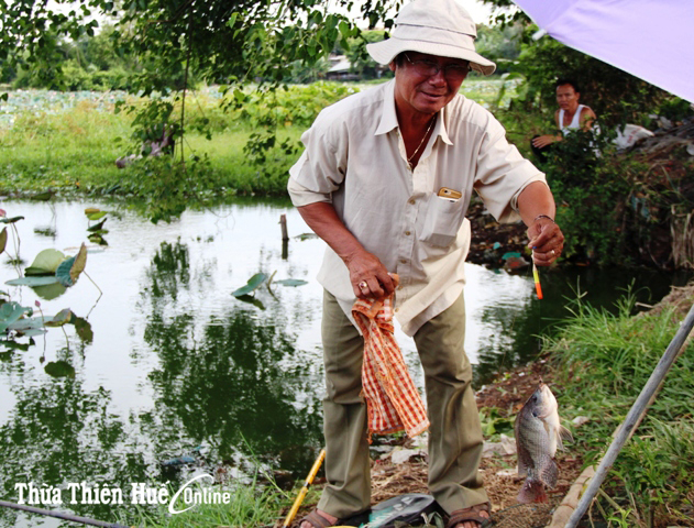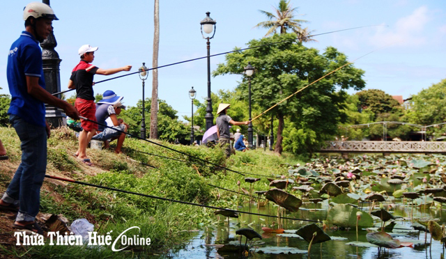 12g trưa, hơn chục “cần thủ” ngồi bệt giữa cỏ dọc theo đường Lê Văn Hưu, ánh mắt mải mê theo dõi phao câu bồng bềnh trên mặt nước. Ông Nguyễn Văn Huy (42 tuổi, trú đường Chi Lăng, TP. Huế) tay cầm cần câu, tay vừa ăn bánh mì hốt hoảng khi để sẩy con cá rô phi to bằng bàn tay sau mấy giờ liền ngồi “canh me”. Ông Huy cho hay, mùa sen nở cũng là thời điểm cá trong hồ to nhất nhưng cũng khó câu nhất bởi sen dày đặc, chọn vị trí buông câu, đưa cần giựt cá rất cấn cái.