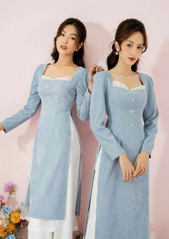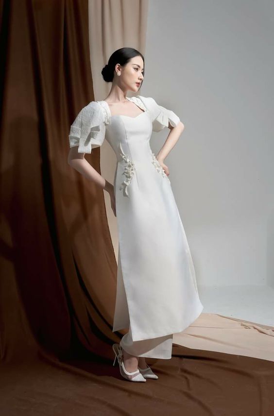Với những ai có bắp tay to những vẫn muốn sở hữu được những chiếc áo dài đằm thắm thì hãy sắm ngay set áo dài cổ vuông tay phồng này. Với thiết kế phòng nhún ở vai không chỉ giúp che đi phần vai thô nhiều khuyết điểm mà còn còn tạo điểm nhấn đặc biệt cho chiếc áo dài.