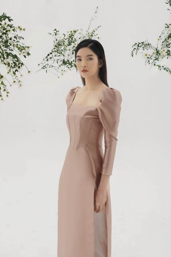 Bên cạnh đó, mẫu áo dài này còn khiến các nàng phải xao xuyến với sự tinh tế trong từng chi tiết nhỏ. Với phần cổ vuông khá rộng khi kết hợp với chiếc vòng cổ phù hợp sẽ tạo nên điểm nhấn cực kỳ hiệu quả. Mẫu áo dài này được sử dụng gam màu hồng đất nhạt với những phần cách điệu ở vai và eo tạo nên sự sang trọng cho người mặc. Cũng chính vì thế, mẫu áo dài này đã chiếm trọn trái tim của các nàng và được các chị em ưu tiên lựa chọn.