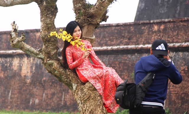 Để có những khuôn hình đẹp, không ít bạn đầu tư rất kỹ. Nhã Linh (ở đường Đào Tấn), vừa về nhà nghỉ Tết sau 1 năm làm việc ở Nhật Bản, thuê hẳn một bạn chụp hình riêng và diện áo dài tự đặt may trước đó. Linh cho biết, muốn có một bộ hình tươi tắn trong tà áo dài mang nét duyên của người con gái Việt Nam, nhất là con gái Huế, để khoe với bạn bè ở Nhật.