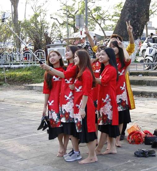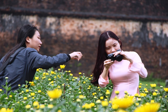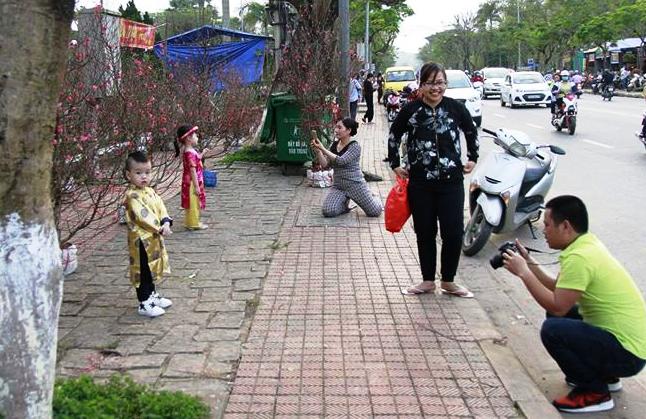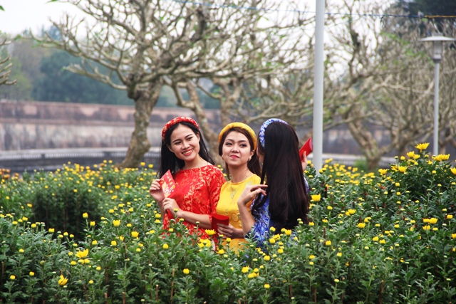 Không chỉ giới trẻ thành phố, giới trẻ vùng ngoại ô, nông thôn cũng háo hức trẩy hội cùng xuân. Đa số họ chọn trang phục truyền thống như áo dài hay áo the khăn xếp để ghi lại những khoảnh khắc trước thềm năm mới. Lê Thị Thu Hà (20 tuổi, huyện Phong Điền) chia sẻ: “Năm mô em cũng lên thành phố du xuân, tham quan chợ hoa. Năm nay, tranh thủ những ngày tạnh ráo em lên Huế sớm hơn, thuê áo dài với giá 150 nghìn đồng để chụp ảnh lưu niệm. Giá chụp ảnh cũng tương đối phù hợp, em thuê hai tiếng với giá 200 nghìn”.