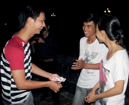Tìm kiếm trên Google, gõ cụm từ “ảo thuật Huế” chỉ cho ra vài kết quả, trong đó, hầu hết là câu hỏi “học ảo thuật ở đâu”? Theo giới thiệu của người quen, tôi tìm đến ATH (Ảo thuật Huế), một forum từng thu hút 300 thành viên cả nước tham gia cách đây 2 năm. Tuy nhiên, do các thành viên trong ban quản trị đang tuổi học tập nên việc duy trì hoạt động của forum này không còn thịnh như trước. Một số thành viên chủ chòm của ATH hiện vẫn “off line” định kỳ, tiếp tục nuôi dưỡng niềm đam mê. Trần Hồng Sang - thành viên quản trị forum đến với ảo thuật được 7 năm là người thường xuyên kết nối và tổ chức họp mặt cho biết: “Ảo thuật có hai lĩnh vực: ảo thuật sân khấu thường sử dụng đạo cụ (đòi hỏi có sự đầu tư về mặt kinh phí); ảo thuật salon (đường phố) đạo cụ đơn giản, yêu cầu sự khéo léo của đôi tay. ATH chủ yếu biểu diễn Flourish (múa bài nghệ thuật), sử dụng kỹ năng khéo léo của đôi tay và việc hoán đổi, đoán định các quân bài trước mặt người xem. Mỗi thành viên trong nhóm tự luyện tập ở nhà, sau đó sẽ trình diễn lúc họp mặt để rút kinh nghiệm và chia sẻ kỹ năng cho nhau. Nhiều bạn đến với nhóm chỉ thích “lật tẩy” hoặc sau khi được truyền đạt một vài ngón nghề thì đã vội khoe mẽ nên không bám trụ được lâu. Chỉ những ai kiên trì, luyện tập thường xuyên và có ý tưởng sáng tạo mới sống bền với ảo thuật”.