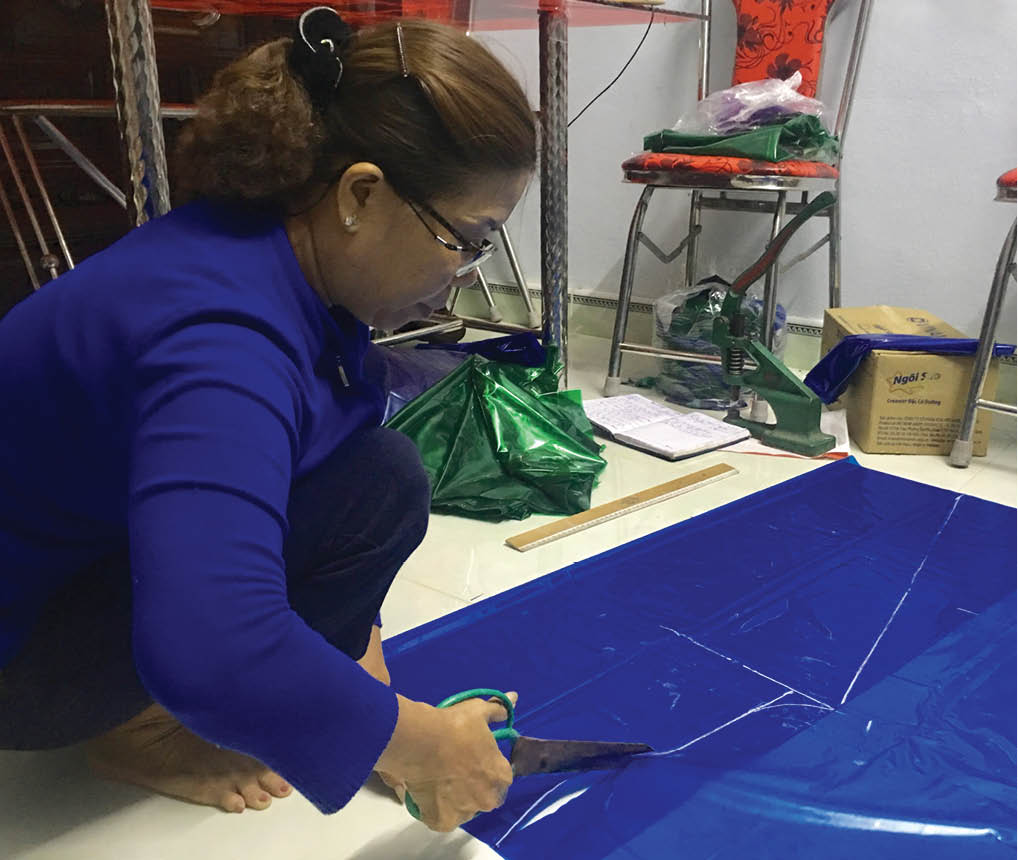 Không ở nơi góc chợ như những thợ dán áo mưa “chính hiệu”, hàng chục năm nay bà Cúc may dán áo mưa tại mình. Với thợ dán áo mưa, việc của họ là sửa những chỗ lủng, hỏng. Nhưng với người phụ nữ sinh năm 1965 này, nghề của bà là làm ra một chiếc áo mưa hoàn chỉnh.