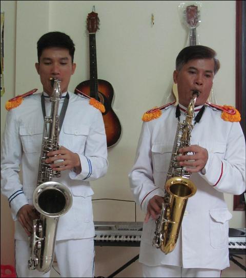Anh Nguyễn Hữu Lân và con trai Nguyễn Hữu Thắng (bên trái) - thế hệ saxo thứ ba. Ảnh: K.O
