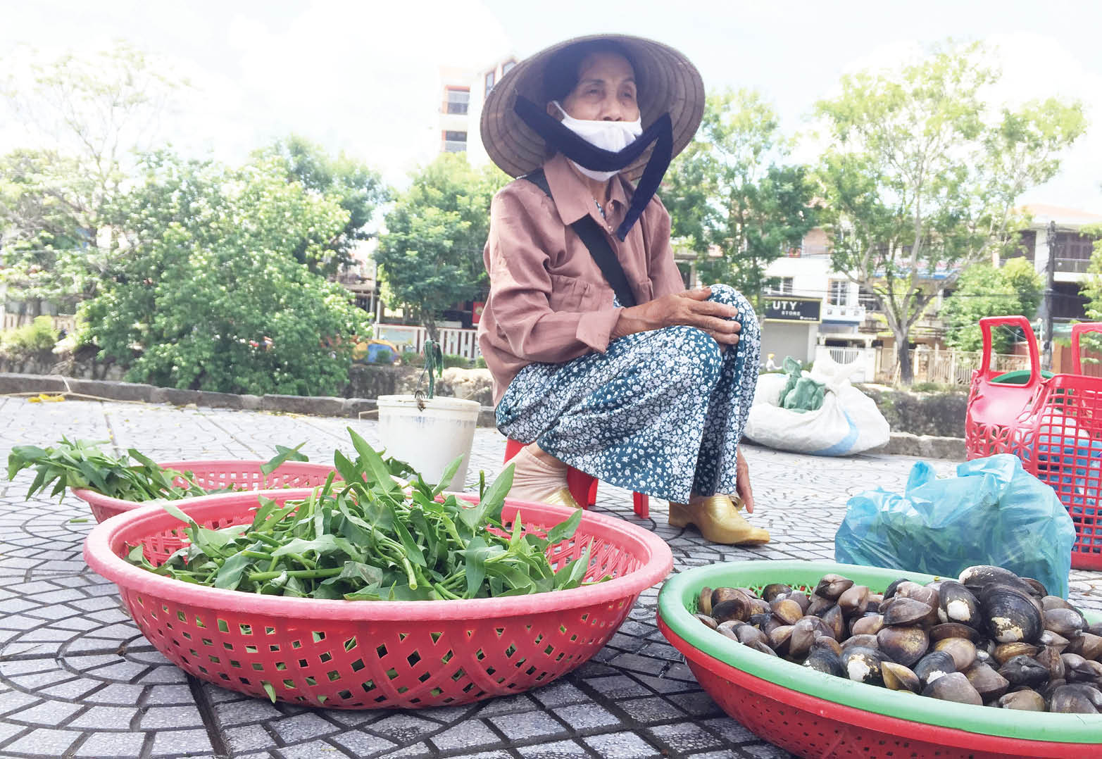 Một bịch hến, một bịch rau muống, đó là tất cả hàng hóa của mệ Lan. Mấy ngày trước nắng nóng, đám đậu cove bán không kịp nên bị teo tóp hết, vậy là lỗ vốn, nên mệ chưa dám lấy thêm rau, củ để bán. Mớ hàng lỏng lẻo ấy, tuy lời lãi chẳng mấy, nhưng cũng đủ giúp mệ cùng chồng gói ghém sống qua ngày. Cho nên ngày hai buổi, mệ vẫn túc tắc ra chợ. “Đến khi mô không còn sức ra chợ nữa, thì mới ở nhà”, mệ nói.