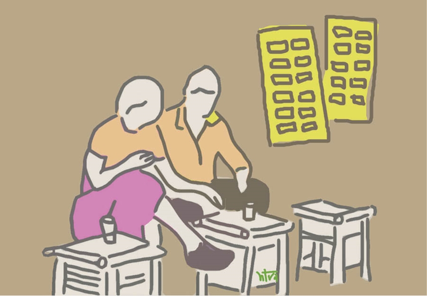 Quán cà phê nơi ngã tư đường vừa mở cửa. Người đàn ông bê từng chiếc ghế gỗ đặt ngay ngắn bên hiên nhỏ. Hiên nhà quét lớp vôi màu vàng sậm làm nổi bật bức tranh đồng quê treo ở góc, nơi đó có chậu dây thường xuân xanh mướt, ôm lấy một phần khung gỗ màu nâu gụ.