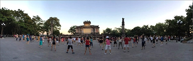 Có một nhân vật trung tâm duy trì và phát triển phòng trào này chính là bác Thương. Nhà bác ở bến xe phía Nam, mỗi sáng, nắng cũng như mưa bác đều khệ nệ chở trên chiếc xe máy của mình một chiếc loa to đến sân bia Quốc Học, điều chỉnh nhạc cho mọi người tập luyện. Khi mọi người đang tập, bác Thương lại sắp xếp những chiếc xe máy, xe đạp cho gọn gàng. Có hôm, vừa đến sân đã thấy bác với cái chổi trong tay, hoặc đang nhặt từng cọng rác để sân tập luôn sạch sẽ. Những hôm trời mưa, liếc nhìn phía chiếc loa đang phát ra tiếng nhạc, đã được bác Thương phủ lên đó mấy tấm ni lon. Sân bia Quốc Học, mỗi sáng người tập khá đông nhưng lúc nào cũng theo lối, theo hàng. Được vậy là nhờ bác Thương đã kỳ công chấm bốn nốt sơn xanh, đỏ cho mỗi vị trí của người tập.