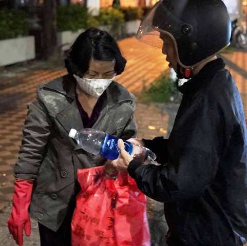 Thành viên Nhóm thiện nguyện Người Việt Trẻ tặng quà cho người mưu sinh trong đêm