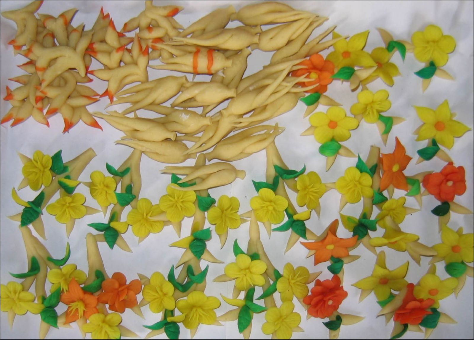 Ngoài bánh hình củ nhân sâm, củ gừng, bánh hoa gồm các loại hoa quý như: hải đường, mai, lan… các loại hoa trên đều được tạo hình có đủ cành lá và phối các màu xanh, đỏ, vàng rất đẹp.