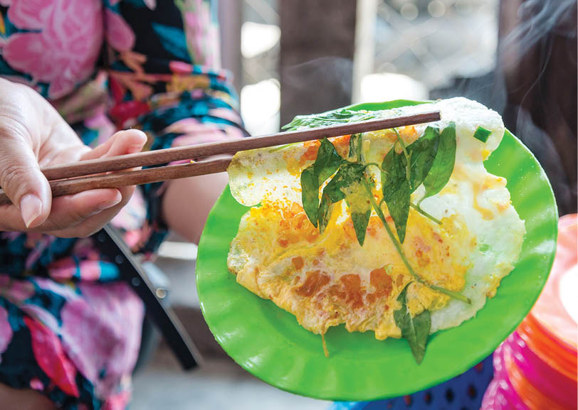 Món bánh ép O Kiều có gì mà hấp dẫn vậy. Cũng là bột lọc nhồi, thêm lát mỡ, hành và trứng ép chặt giữa hai tấm gang nóng được đặt trên bếp than lửa cháy có ngọn. Tấm bánh ép xong to bằng chiếc dĩa nhỏ, có độ mềm dẻo của bột lọc, thơm ngát mùi trứng chiên, bốc hơi nóng hổi. Bánh ăn kèm với rau thơm, dưa chuột, chua ngọt là cà rốt, đu đủ bào sợi, tất cả chỉ có thế nhưng quán này ngon hơn quán kia chính là nhờ nước mắm.