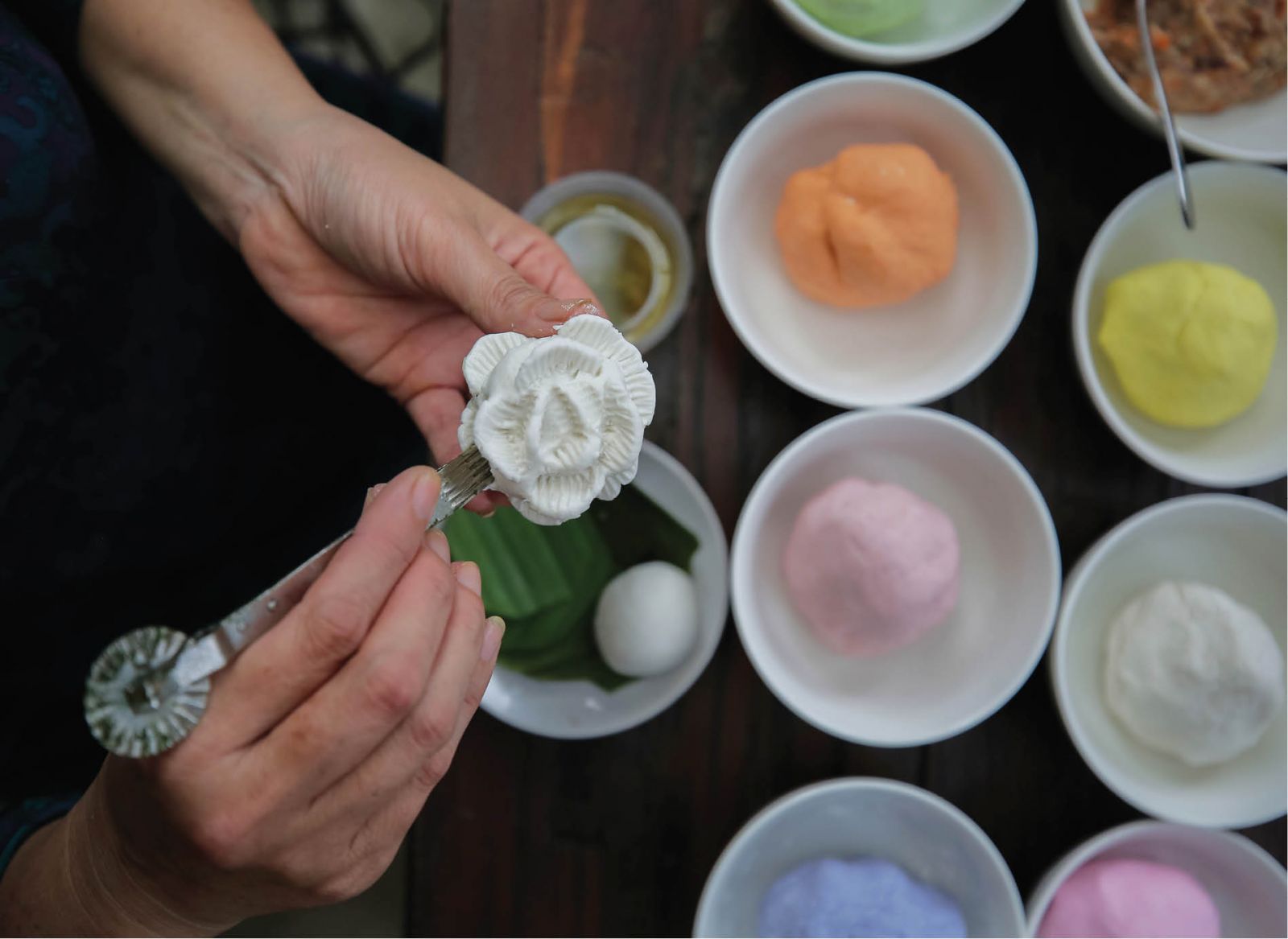 Háo hức nhất với tôi là công đoạn nặn bánh. Đáp lại sự háo hức của tôi, chị Hương bày tôi cách chia bột thành từng viên bằng quả chanh. Nắn bột mỏng và hơi trũng, cho nhân vào, rồi xếp mép bánh lại. Tiếp đó, chị Hương dùng dụng cụ bắt cánh hoa hồng ấn tạo nhụy hoa và kẹp 4 cánh hoa đối xứng nhau ở tầng thứ nhất, tầng hoa thứ hai xen kẽ với tầng thứ nhất tiếp tục hiện ra và đến khi tầng cánh hoa thứ ba xen kẽ với tầng thứ hai hoàn thành, một bông hoa hồng giống như thật đã hiện ra trong sự thích thú của tôi. Dưới bàn tay khéo léo của chị Hương, những bông hoa hồng đủ màu sắc chẳng mấy chốc đã hiện ra, trông e ấp và xinh xắn quá chừng.