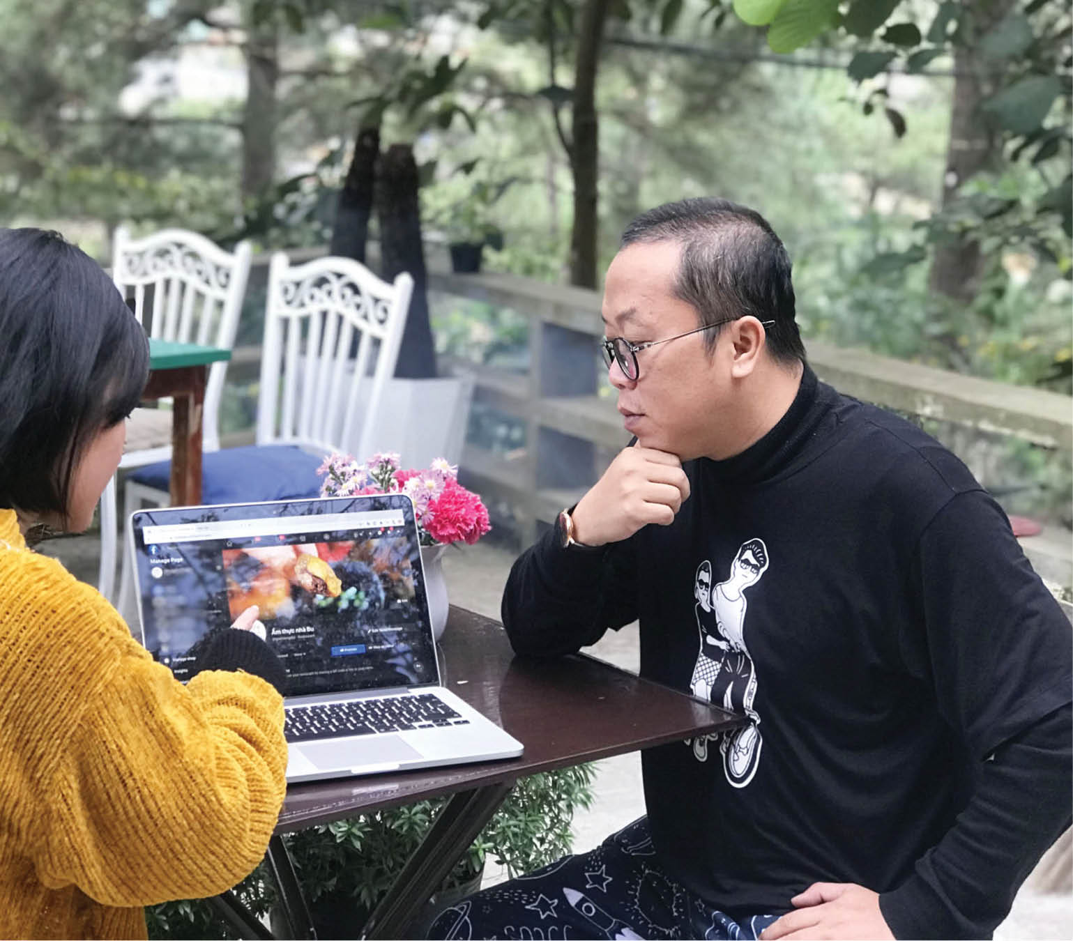 Nguyễn Duy Vĩ (bìa phải) cùng cộng sự bàn bạc các slogan cho sản phẩm trên “cửa hàng online”