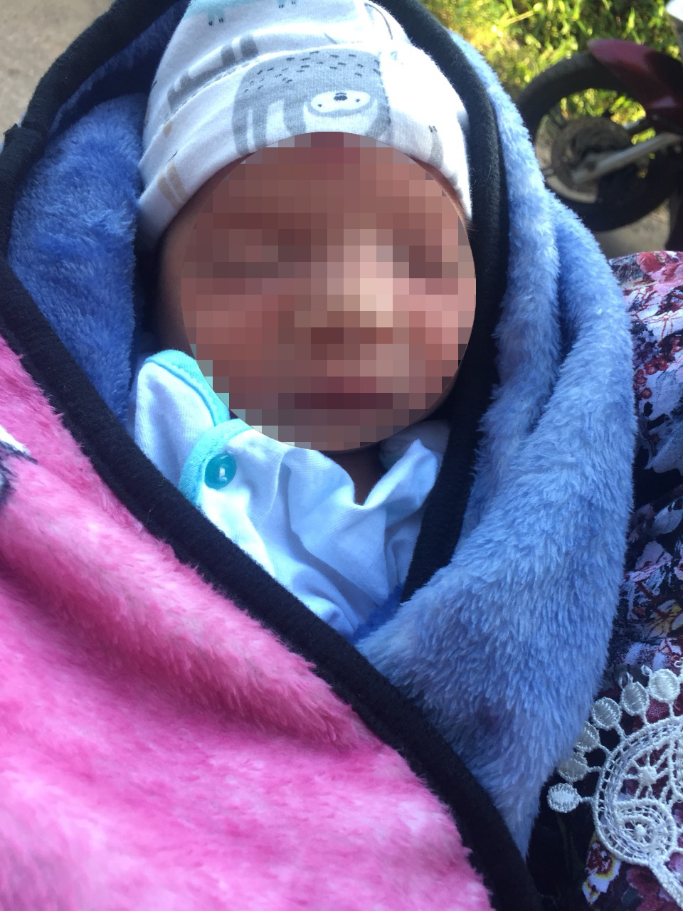 Bé gái bị bỏ rơi khoảng 3 ngày tuổi, chưa rụng cuống rốn, nặng 3kg, mặc áo trắng đội mũ, bên ngoài quấn khăn lông màu xanh và tím.