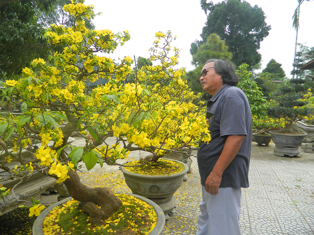 Nghệ nhân Nguyễn Văn Dạt bên những chậu mai vàng trước sân.