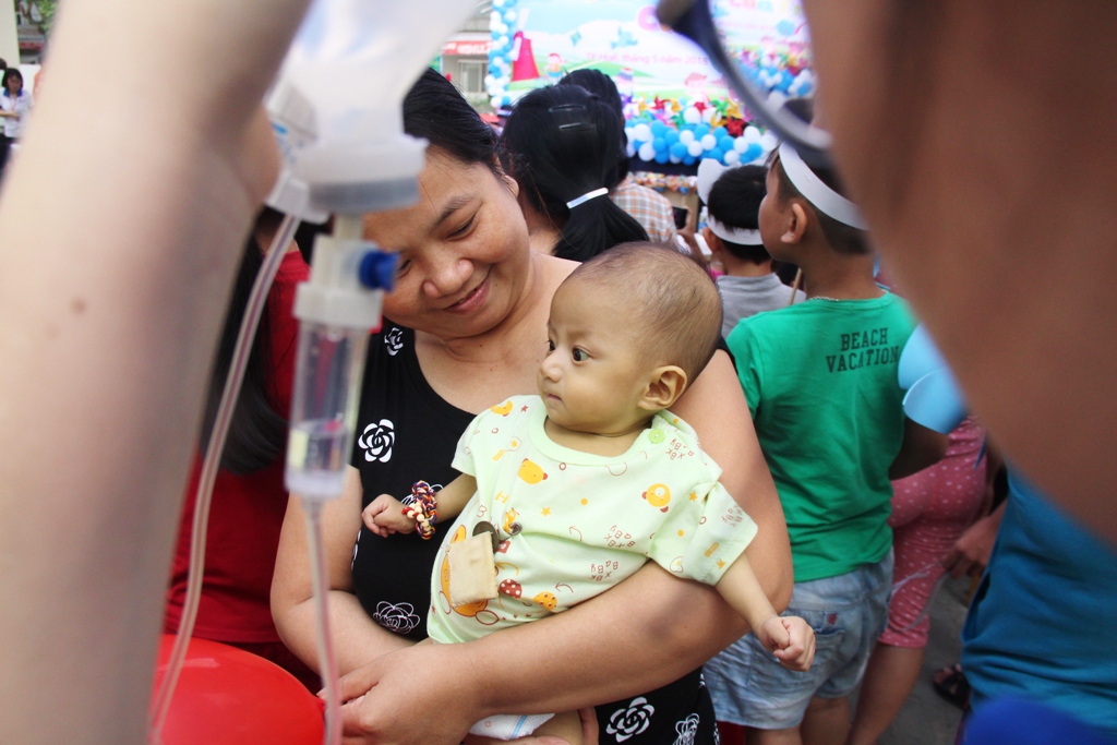 Một bệnh nhi dù đang truyền thuốc vẫn được tình nguyện viên hỗ trợ di chuyển bình truyền từ giường bệnh xuống nơi tổ chức
