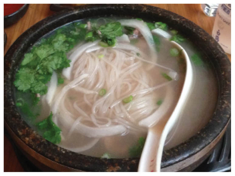 Độc đáo nhất là lần vào quán Nhật ở thành phố Milwuakee (bang Winconsin-Mỹ). Thấy thực đơn có bún bò Huế, tôi tò mò gọi thử. Kết quả là phải ăn bún bằng...vá và tô bún kèm sợi phở mà trong đời tôi cũng chưa thể nào tưởng tượng đến.