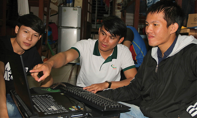 Veha Keophila (giữa) hướng dẫn bạn học bài