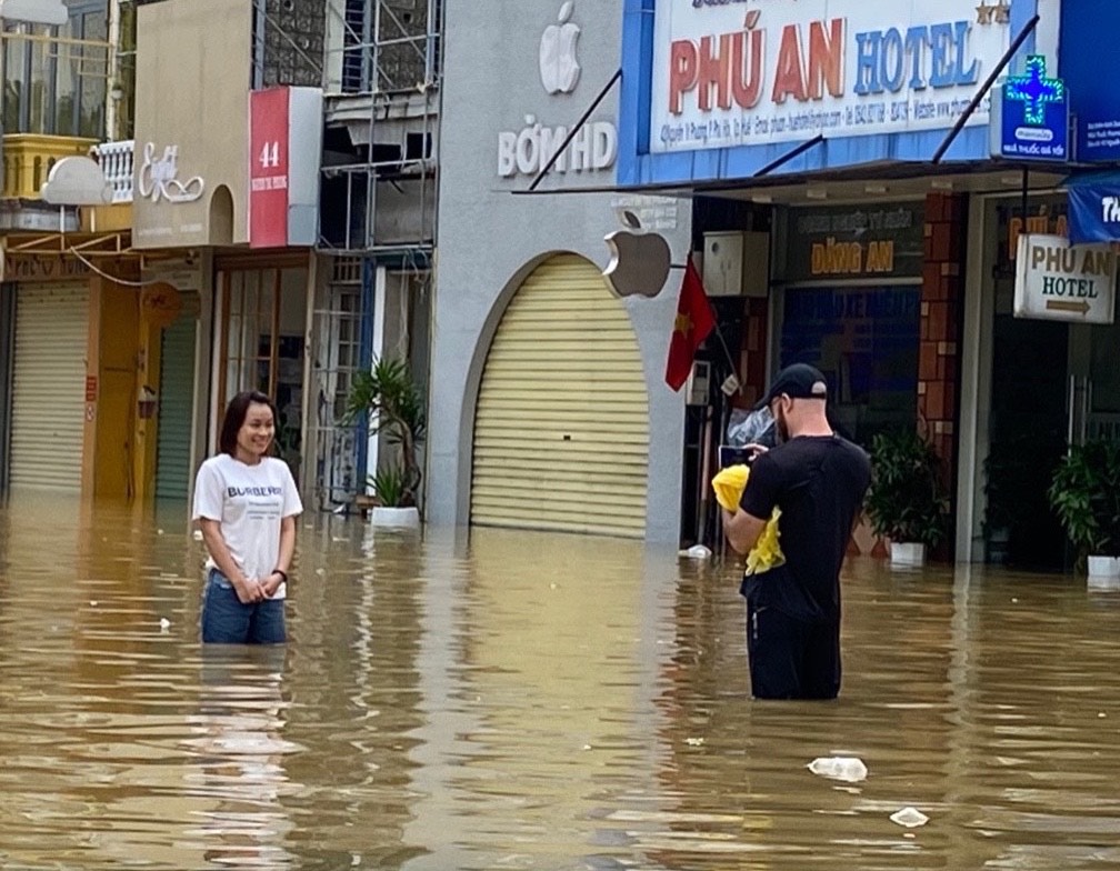 Một du khách nước ngoài hào hứng chụp ảnh cùng bạn gái trên đường phố ngập nước