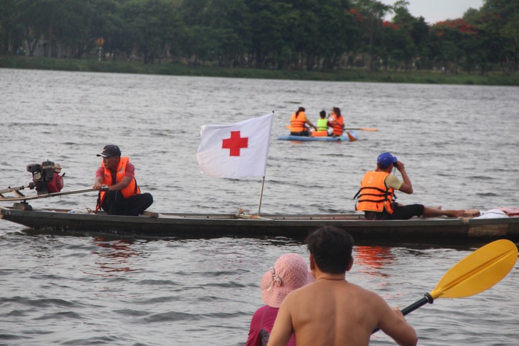 Theo quan sát, ở khu vực bến me, một bảng cảnh báo người dân cũng được dựng lên. Ở khu vực đối diện bên kia sông, công viên gần cầu Dã Viên, đơn vị cho thuê thuyền Sup cũng bố trí thuyền cứu hộ túc trực trong quá trình khách thuê thuyền chèo.