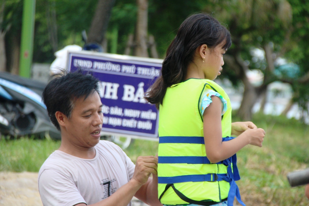 Phụ huynh đeo áo phao cẩn thận cho trẻ em trước khi xuống nước