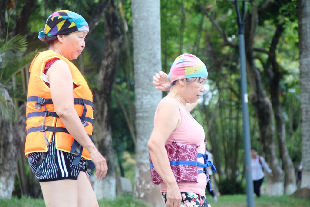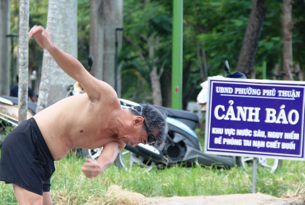 Trong số nhiều người ra sông Hương tắm có không ít người cao tuổi, họ trang bị bảo hộ kỹ càng