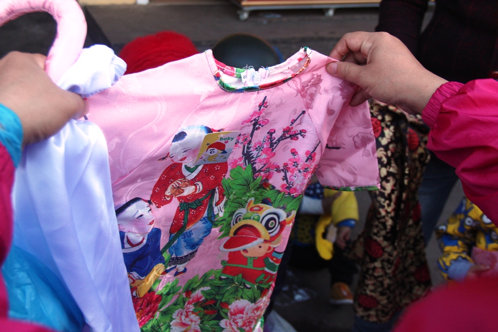 Một chiếc áo xuân cỡ con nít được người mua xem qua, xem lại trước khi quyết định có hoặc không mua