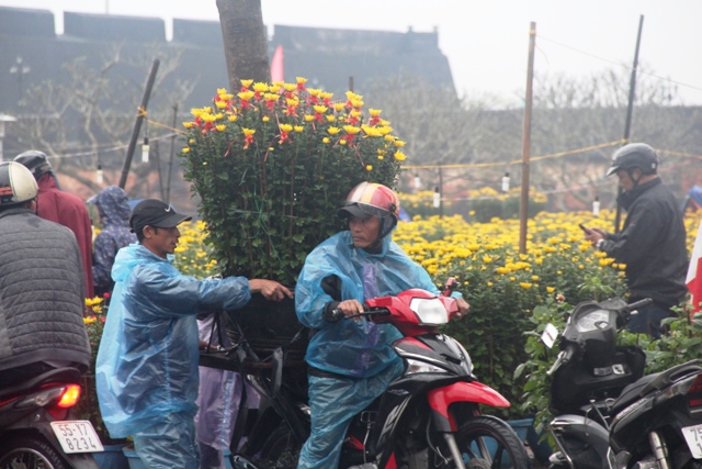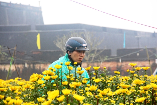 Một màu vàng ngập tràn ở chợ hoa Phu Vân Lâu cho thấy sức mua khá chậm so với mọi năm khi mà thời tiết mưa lạnh liên miên trong hai ngày qua ảnh hưởng đến người kinh doanh hoa rõ rệt. Mặc dù đã giảm giá hơn một nửa từ 300.000 – 600.000 đồng xuống còn 150.000 – 300.000 đồng/cặp (2 chậu) tùy loại lớn nhỏ nhưng rất ít người mua hoa cúc. Chị Nguyễn Thị Hạnh (xã Thủy Vân, thị xã Hương Thủy) kinh doanh hơn 300 chậu hoa cúc vô cùng lo lắng bởi ảnh hưởng của thời tiết hai ngày qua nên lượng bán ra không đáng bao nhiêu. Chị Hạnh kể rằng, so với thời điểm này mọi năm lượng người đi chợ hoa và mua hoa tết giảm đáng kể. Gần như hai ngày qua có quá ít người đi chợ hoa bởi mưa lạnh. “Chợ hoa mà chỉ có người bán với xe ôm, còn lại không thấy khách hàng”, chị Hạnh than thở.