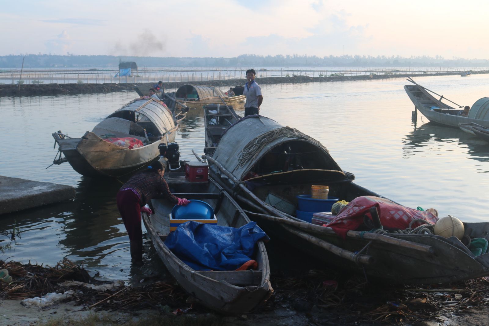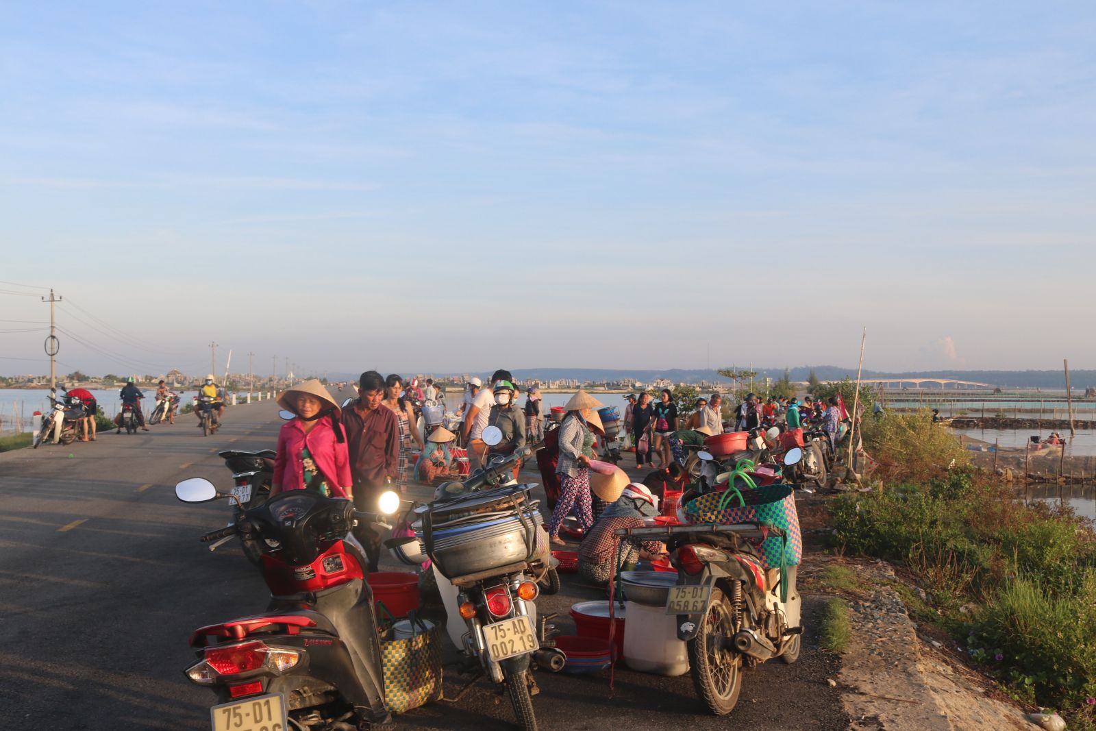Băng qua cánh đồng Thanh Phước, chúng tôi có mặt ở chợ sớm Hương Phong. Khu chợ cách cầu Tam Giang tầm 1km, tập trung khá đông người bán, mua. Đây được xem như chợ đầu mối hải sản của người dân Hương Phong, Hải Dương… Chợ đông từ 4h sáng đến tầm 6h30 thì chợ chính thức tan.