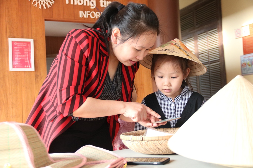 Một du khách Hà Nội dẫn con đến tìm hiểu những sản phẩm trưng bày tại Nhà Nông nụ Cầu ngói Thanh Toàn