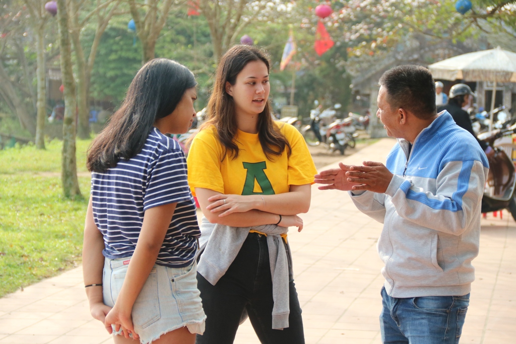 Khách Tây nghe giới thiệu về Cầu ngói Thanh Toàn trước khi đi tham quan