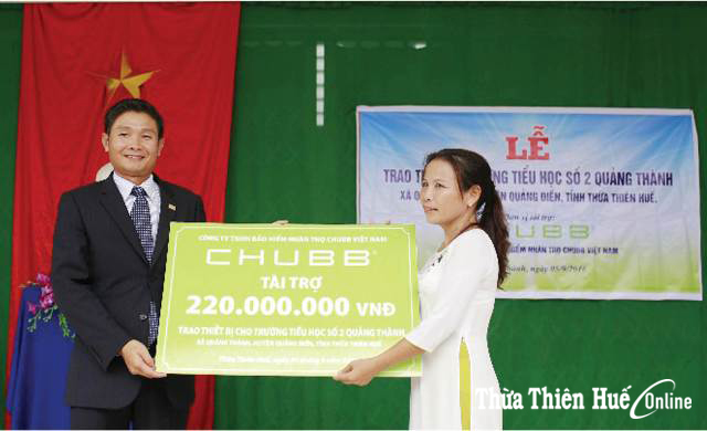 Nhân dịp năm học mới tháng 09/2016, thông qua Quỹ Hỗ trợ Phòng tránh thiên tai miền Trung, Quỹ Chubb Charitable Foundation – International phối hợp cùng Chubb Life Việt Nam trao tặng máy tính, thư viện sách và phòng học tiếng Anh với tổng giá trị tài trợ là 900 triệu đồng cho 4 ngôi trường gồm Tiểu học Xuân Lâm (Phú Yên), Tiểu học số 1 Triệu Độ (Quảng Trị), Tiểu học số 2 Quảng Thành (Thừa Thiên Huế) và Tiểu học số 2 Vĩnh Thành (Nghệ An).