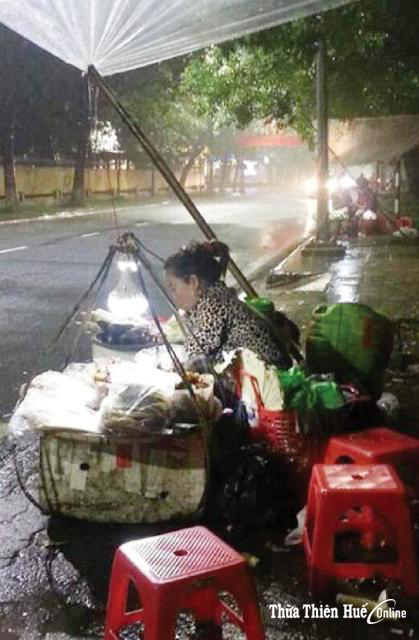 Mọi chuyện vẫn suôn sẻ cho đến khi giọng của hai bím tóc hối hả “Mạ ơi, mấy chú trật tự”. Cả đám nháo nhào, người bưng ghế, người gánh hàng thảy lần lượt vào trong nền cỏ. Tôi chẳng hiểu, cứ ngớ ra. Vài giây sau thì em giúi vào tay tôi bịch nước mắm và vài thứ nữa như van lơn “Chị, bưng cho em cái ni, mau lên”. Chao ơi cái ánh mắt kia tôi đã được nhận bao giờ đâu, cũng chưa đem đi cho ai lần nào nên lạ lẫm và da diết quá. Tôi nhìn em, nhìn đoàn người nháo nhác, nhìn mấy chú trật tự đi qua nói mấy câu cao giọng về phía gánh hàng mà lòng có phần hỗn độn. Cảm giác này mới mẻ quá thể, nên khách ngồi ăn ai cũng vui. Bản thân có nên vui không nhỉ, ai cũng cười, tôi vui một chút chắc vẫn ổn. Nhưng ánh nhìn kia, chỉ riêng mình tôi có thì phải làm thế nào, hành xử ra sao? “Trật tự” qua, mọi chuyện dần trở lại như cũ. Ai cũng yên vị theo cách của mình. Duy chỉ dáng bé nhỏ của hai cái bím tóc bị hắt bởi ánh đèn vẫn lăng xăng lượm lặt mấy thứ còn vương vãi, tay thi thoảng lau mồ hôi trên mặt. Em không nhìn lại tôi lần nào. Do bận, hoặc do mệt. Mẹ con bé cũng không trả lời tôi câu nào. Do bận, hoặc lo.