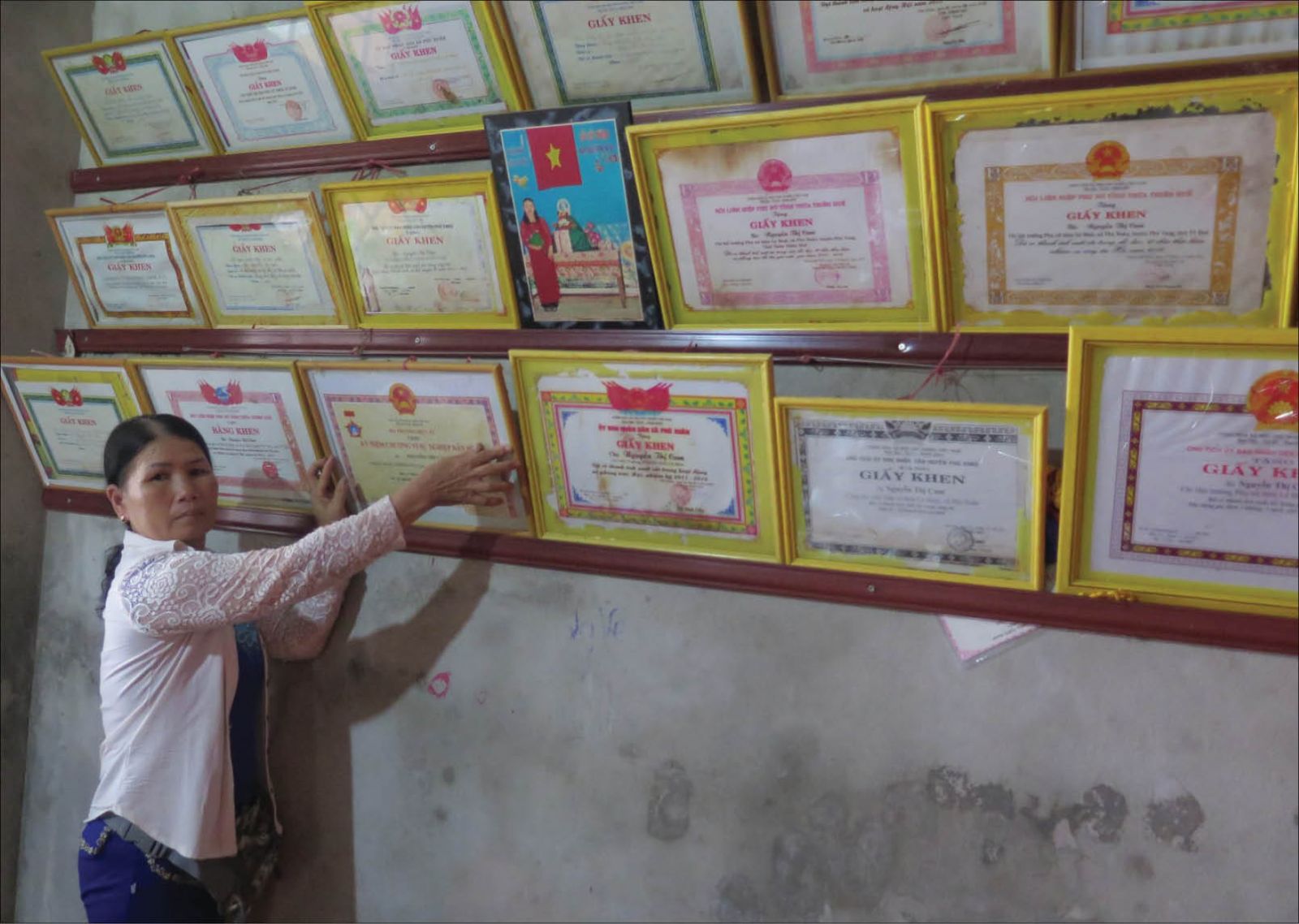 Thấy tôi tò mò, chị Cam nói thêm: “Do mưa lụt ướt hết nên không còn nhiều nữa. Gần 20 năm làm chi hội trưởng phụ nữ, y tế thôn, cộng tác viên dân số, tổ trưởng tổ vay vốn, năm nào tui cũng có ít nhất một bằng khen hoặc giấy khen”.
